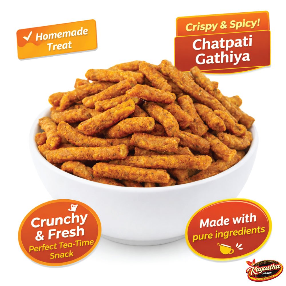 Kayastha Kitchen Chatpati Gathiya is a traditional Indian snack prepared with pure and hygienic ingredients to bring you authentic homemade flavor. Light, crunchy, and perfectly spiced, this snack is ideal for tea-time cravings and everyday munching.
